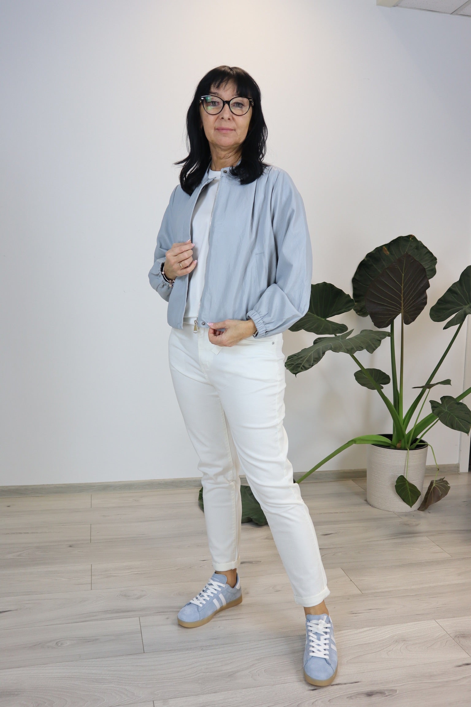 Lekka, krótka kurtka z subtelnym połyskiem i delikatnie bufowanymi rękawami. Zapięcie na suwak, elastyczne mankiety i wygodny krój sprawiają, że świetnie sprawdza się jako casualowe okrycie wierzchnie na cieplejsze dni. Idealna do jeansów i sneakersów.