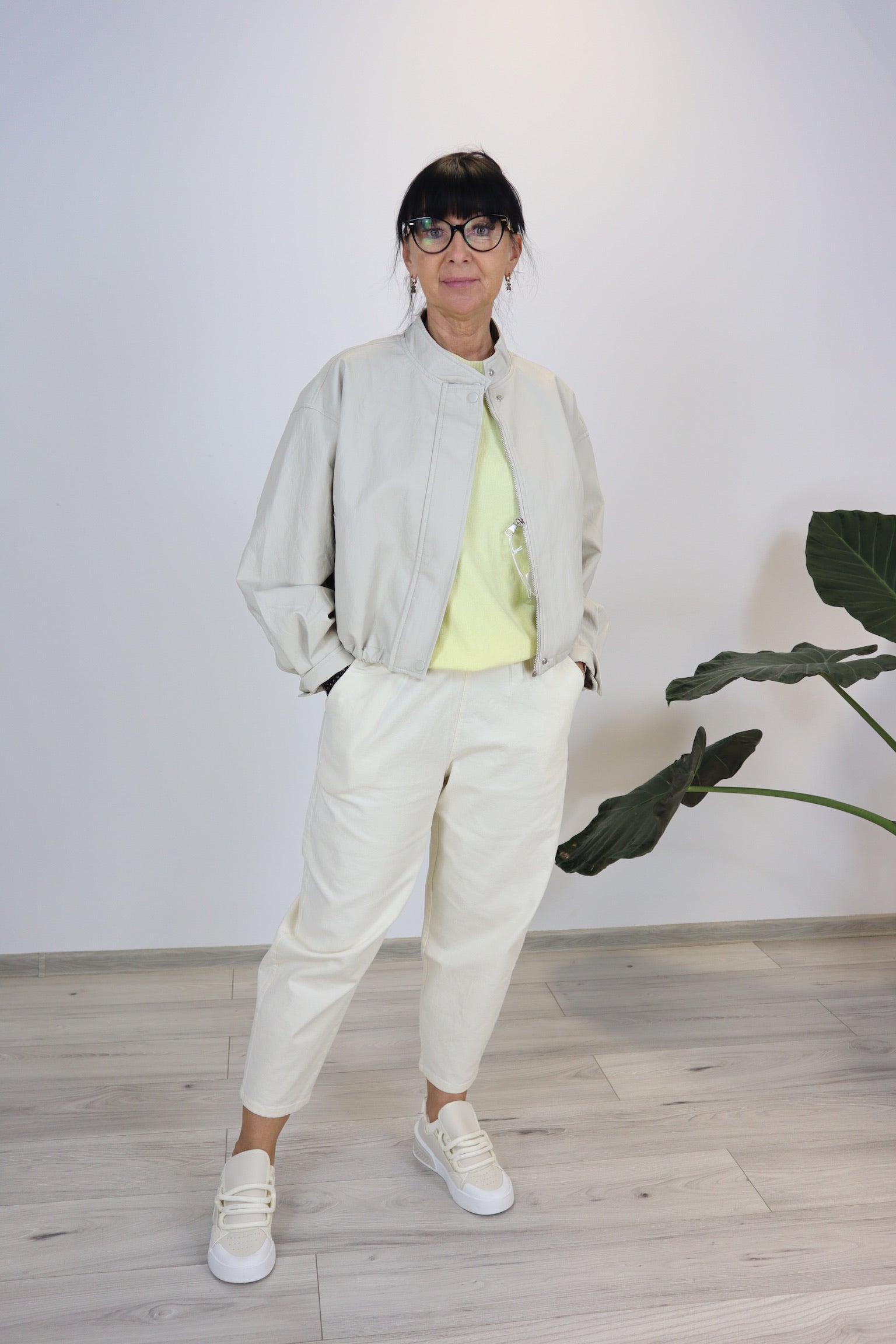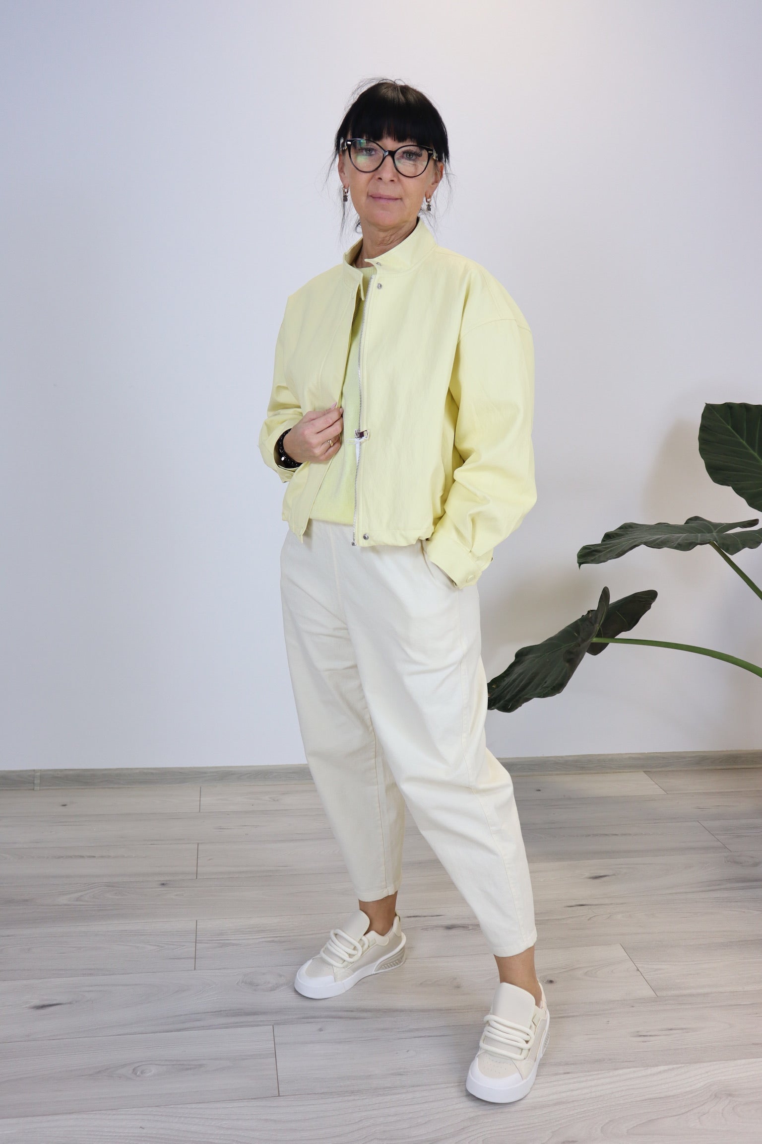 Lekka, minimalistyczna kurtka o prostym, nowoczesnym fasonie. Krótki krój i luźne rękawy nadają jej swobodnego charakteru, jednocześnie zapewniając wygodę noszenia. Zapięcie na suwak i stójka dodają jej subtelnej elegancji, czyniąc ją idealnym wyborem zarówno do casualowych, jak i bardziej stylowych zestawień. Wykonana z lekkiego, przyjemnego w dotyku materiału, świetnie sprawdzi się w sezonie przejściowym. Doskonała propozycja dla osób ceniących prostotę i uniwersalność.