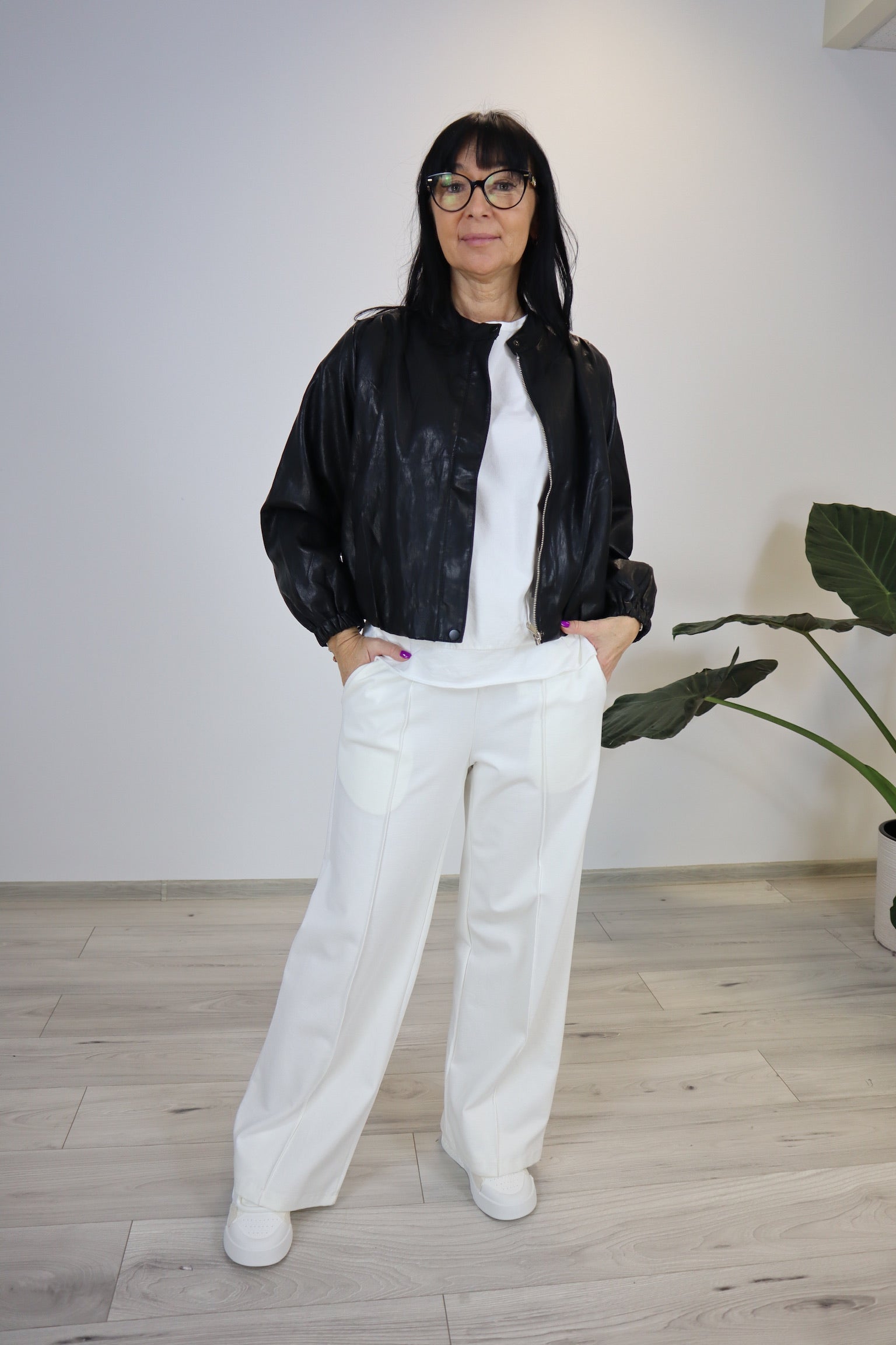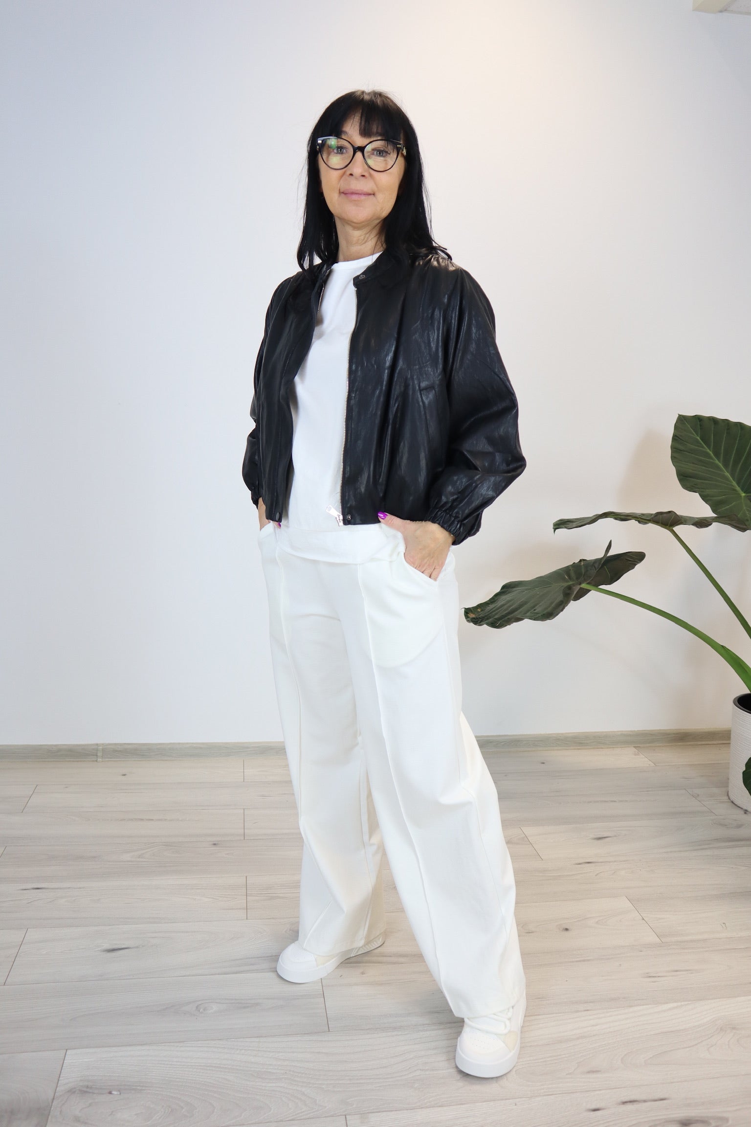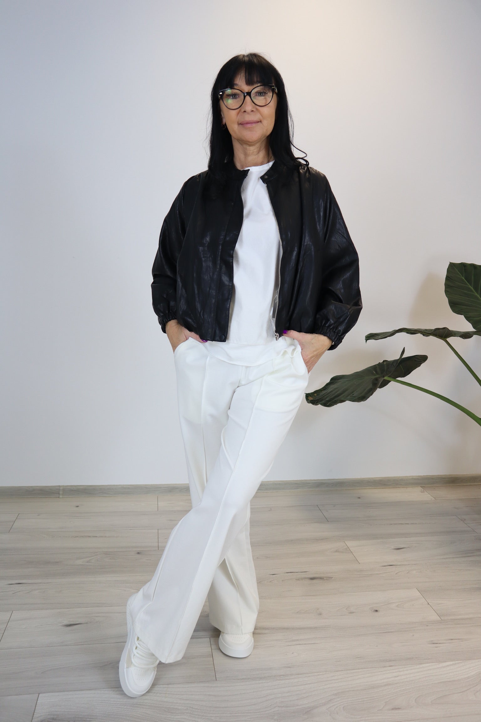 Lekka, czarna kurtka o minimalistycznym kroju, która doskonale wpisuje się w nowoczesne, casualowe stylizacje. Wykonana z lekko połyskującego materiału, dodaje odrobiny elegancji nawet w codziennych zestawach. Krótki fason i delikatnie bufiaste rękawy nadają jej modowego charakteru, a wygodne zapięcie na suwak i napy podkreślają jej funkcjonalność. Idealna do noszenia zarówno z jeansami, jak i eleganckimi spodniami, tworząc ponadczasowy look. Świetny wybór dla kobiet ceniących wygodę i stylową prostotę.