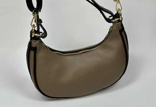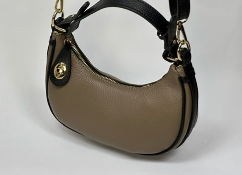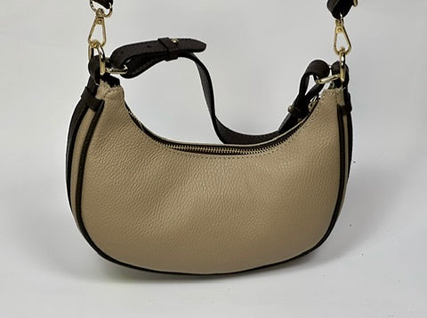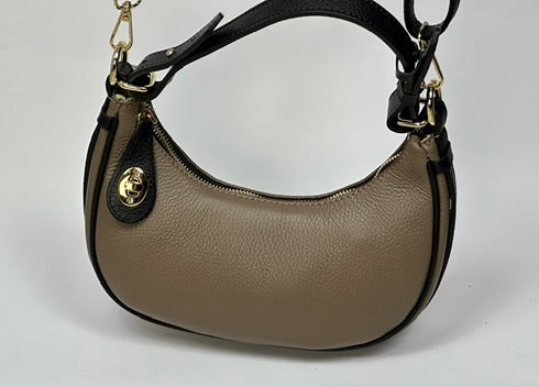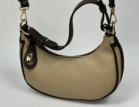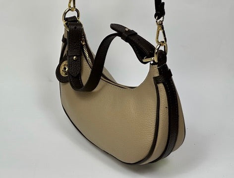 Ta wyjątkowa torebka w kształcie półksiężyca to połączenie elegancji i nowoczesnego stylu. Wykonana z wysokiej jakości skóry, posiada subtelne złote akcenty, które dodają jej szyku. Kompaktowy rozmiar sprawia, że jest idealnym dodatkiem na wieczorne wyjścia, a wygodny pasek umożliwia noszenie jej na kilka sposobów. Neutralna kolorystyka pasuje do każdej stylizacji, czyniąc ją uniwersalnym wyborem dla kobiet ceniących klasę i funkcjonalność.