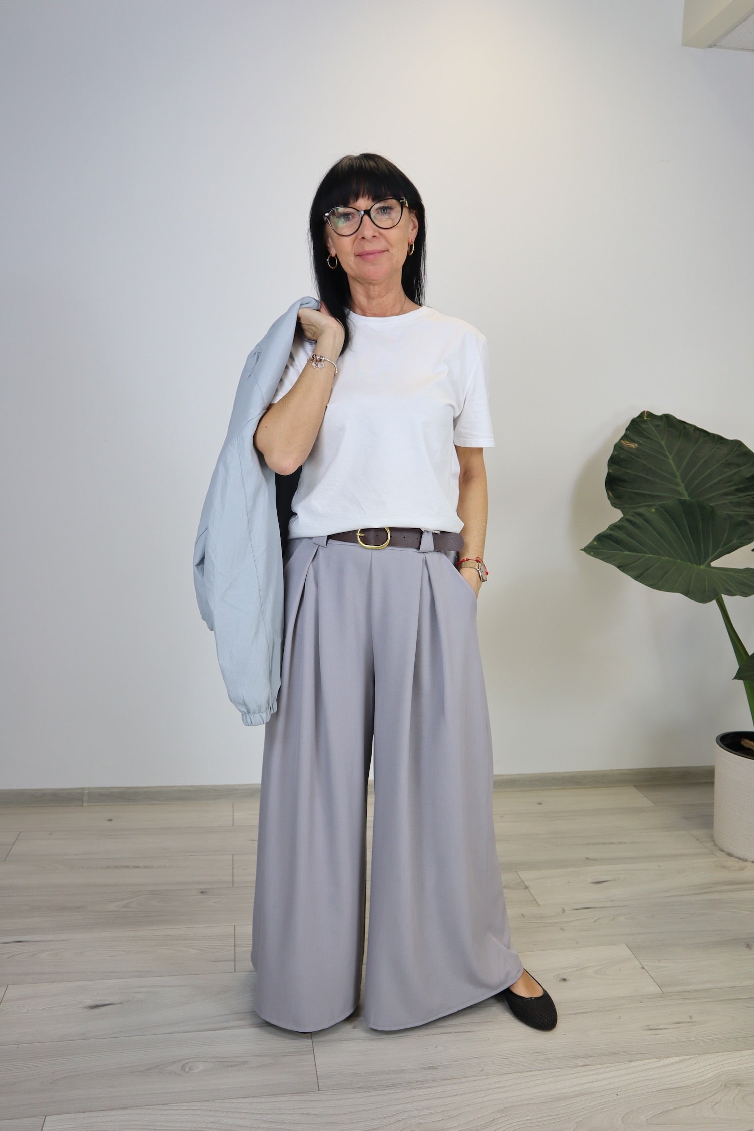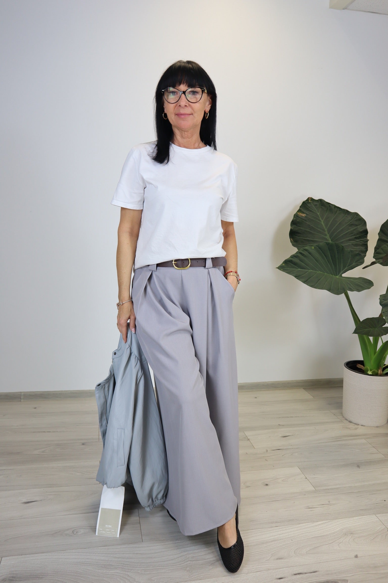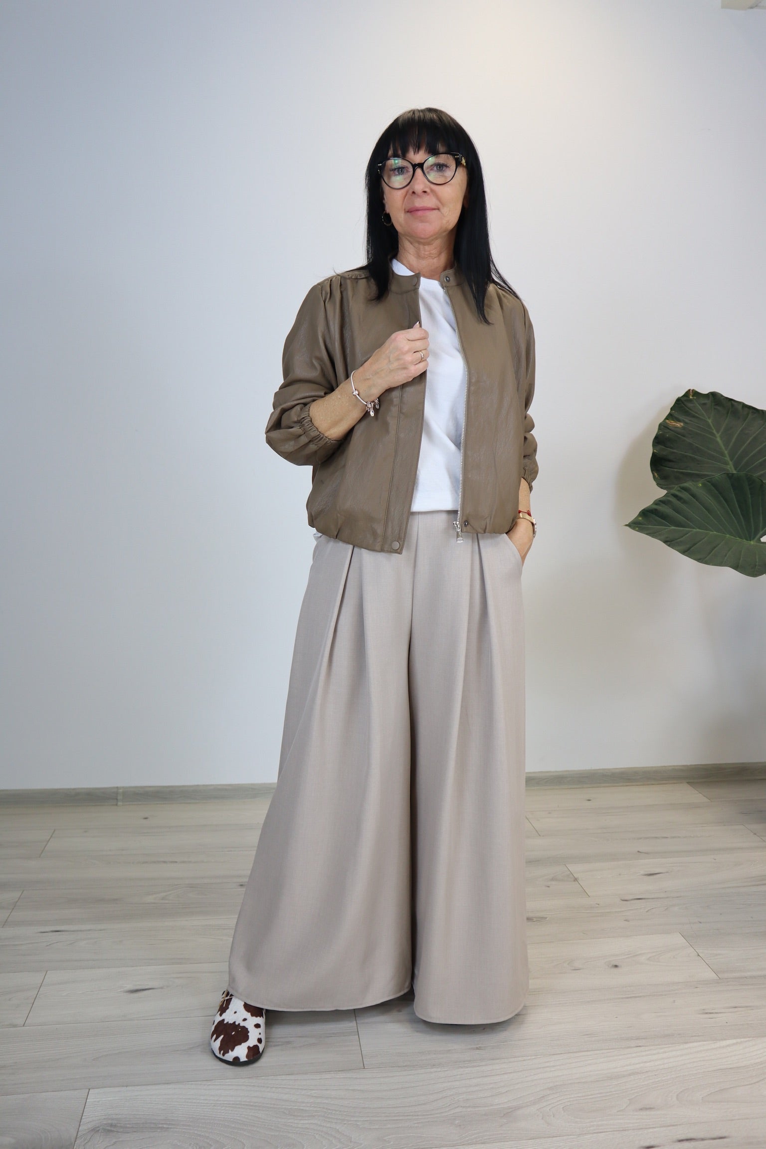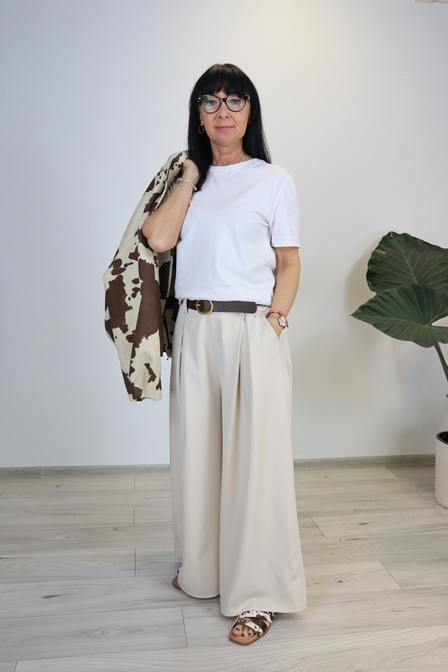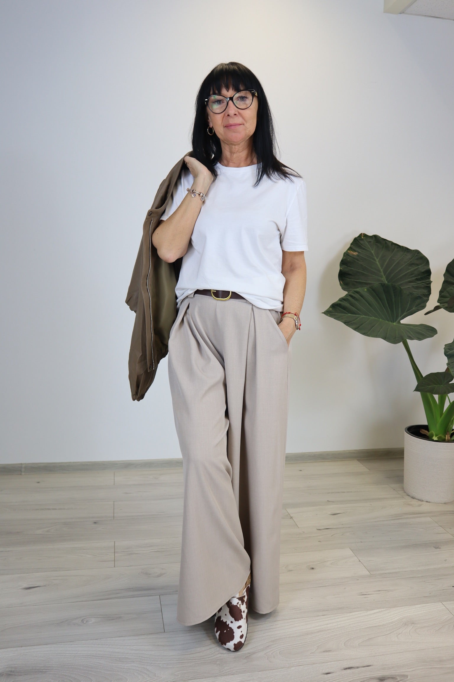 Spodnie o bardzo szerokiej nogawce, wykonane z lekkiego materiału z delikatnym połyskiem. Mają wysoki stan, zaprasowania w kant i luźny, płynny fason, który nadaje sylwetce elegancji i swobody. Idealne do stylizacji codziennych i bardziej formalnych.