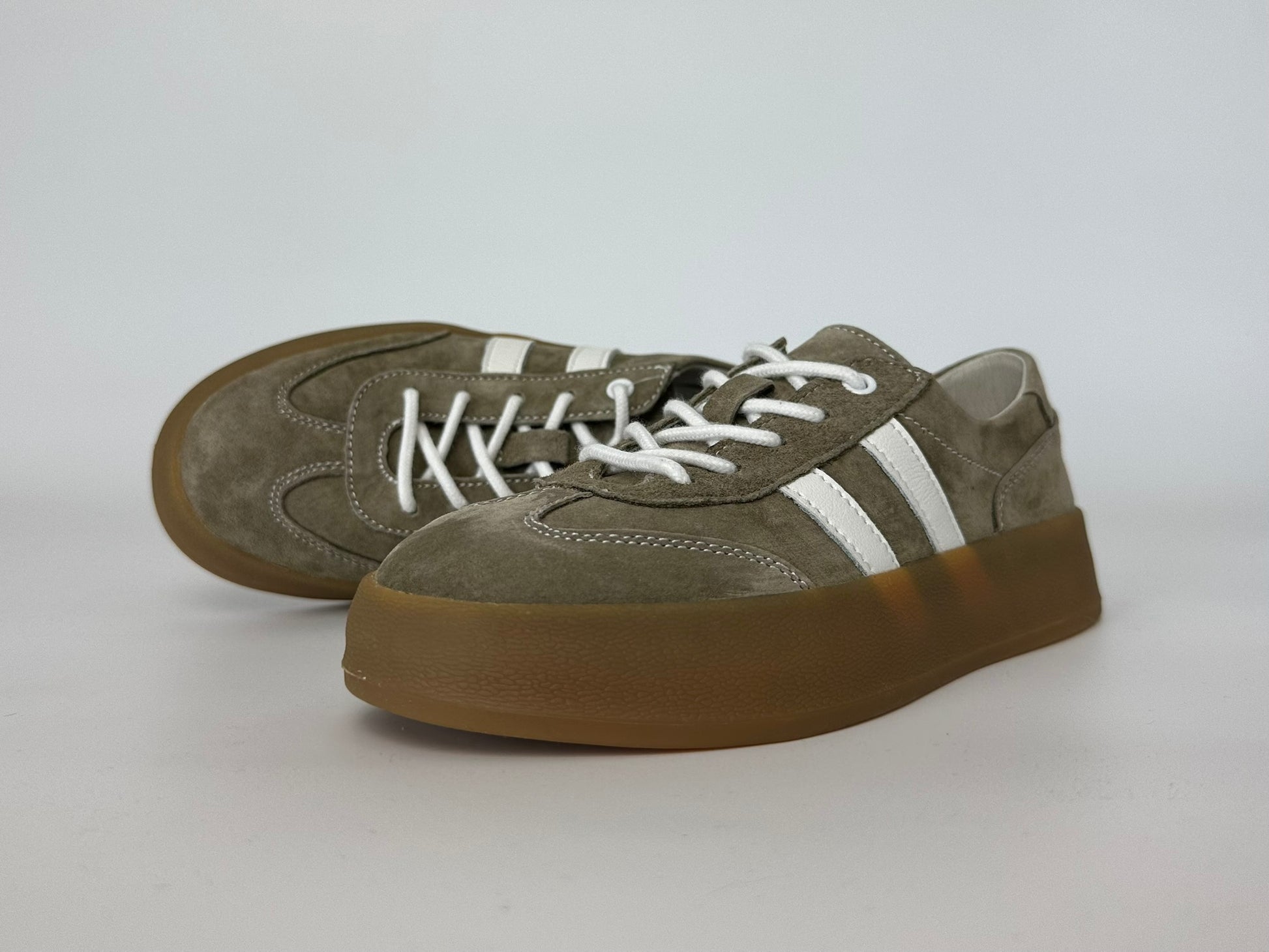 Casualowe sneakersy z klasyczną, sportową sylwetką i gumową, kontrastową podeszwą. Wykonane z miękkiego zamszu, ozdobione charakterystycznymi paskami po bokach. Uniwersalne, lekkie i idealne do miejskich stylizacji – łączą wygodę z modowym twistem retro.