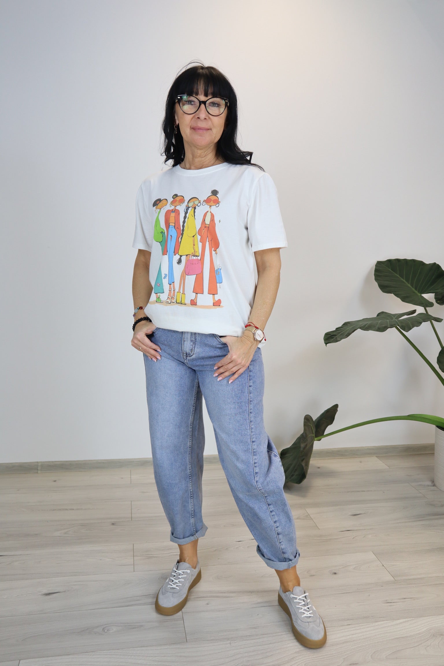 Biała, klasyczna koszulka z krótkim rękawem, ozdobiona barwną grafiką przedstawiającą stylowe, nowoczesne postaci. Wykonana z miękkiej, przewiewnej bawełny, zapewnia komfort noszenia przez cały dzień. Luźny krój sprawia, że świetnie komponuje się zarówno z jeansami, jak i spódnicami, tworząc swobodny, ale modny look. Kolorowy nadruk dodaje jej charakteru i pozwala wyróżnić się w tłumie. Idealna dla kobiet, które lubią połączenie casualowego stylu z modowym akcentem.