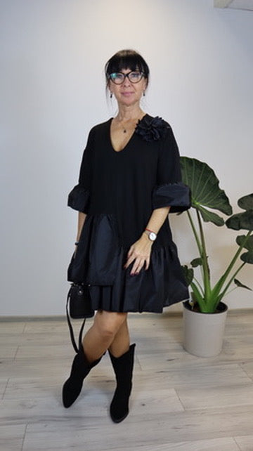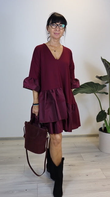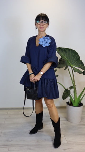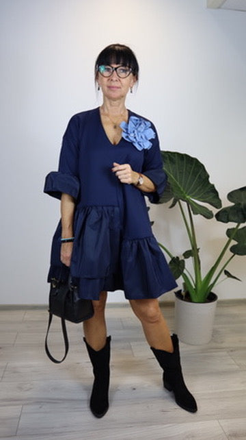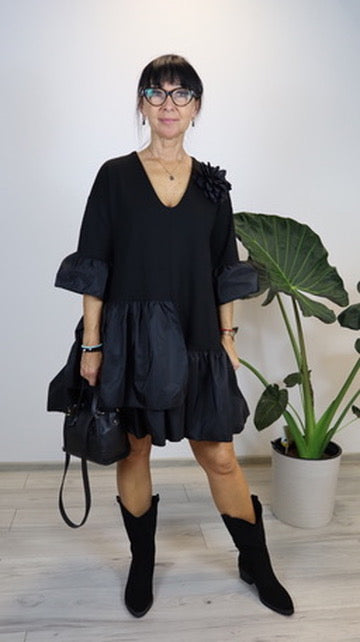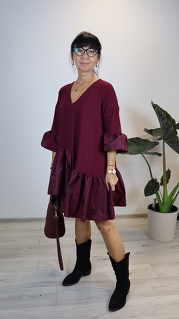 Stylowa sukienka o luźnym kroju z głębokim dekoltem w kształcie litery V, która nadaje sylwetce lekkości i elegancji. Posiada efektowne falbany na dole oraz na rękawach, dodające jej objętości i dynamicznego wyglądu. Szerokie rękawy nadają stylizacji swobodny, boho charakter. Doskonale sprawdzi się zarówno na co dzień, jak i na bardziej eleganckie okazje. Idealnie komponuje się z wysokimi kozakami i torbą na ramię.
